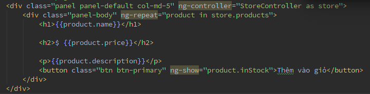 Đúng là như vậy có thể giải quyết được nhưng nếu danh sách sản phẩm dài ra thì khá là vất vả cho developer, haha. Không sao Angular hỗ trợ chúng ta iterate danh sách bằng cách sử dụng directive ng-repeat. Sử dụng như sau.
