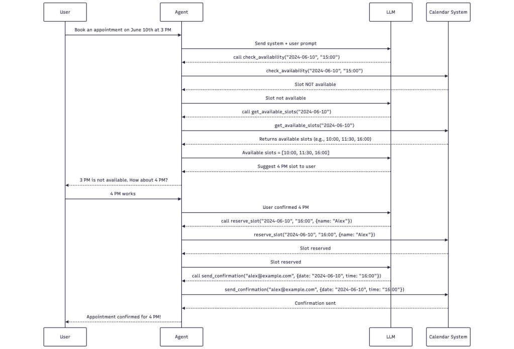 send_confirmation("alex@example.com", {date: "2024-06-10", time: "16:00"}) - The agent executes and confirms back to the user.