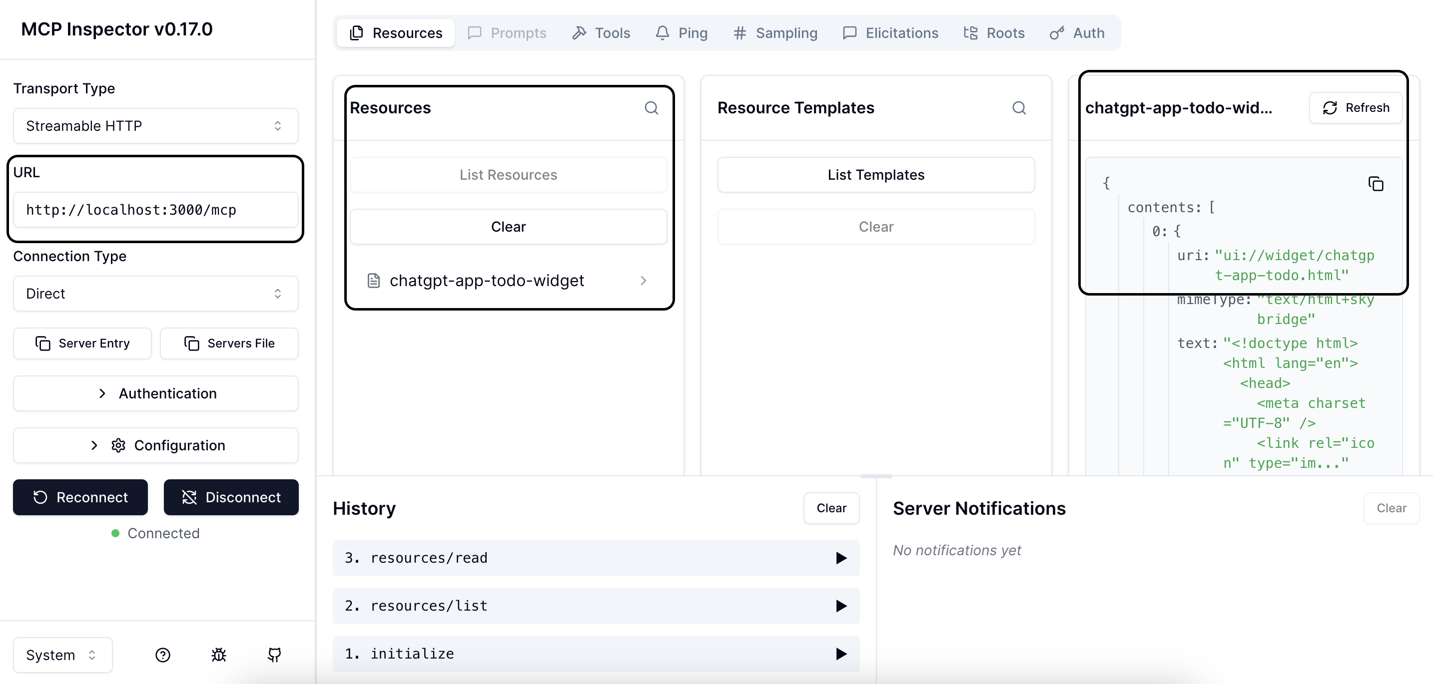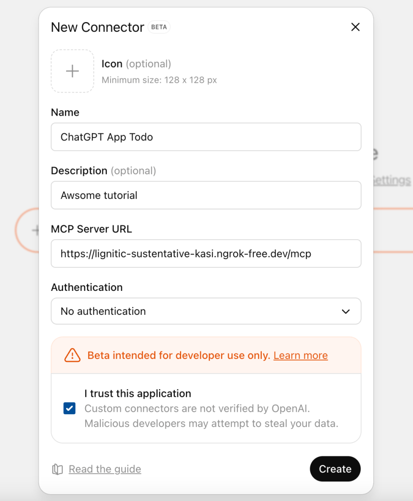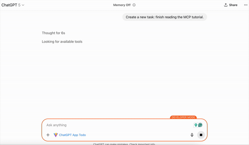 Once you start your server and register it with ChatGPT, you’ll be able to chat: “Create a new task: finish reading the MCP tutorial.” ChatGPT will call your tool, update the shared data, and render your widget.