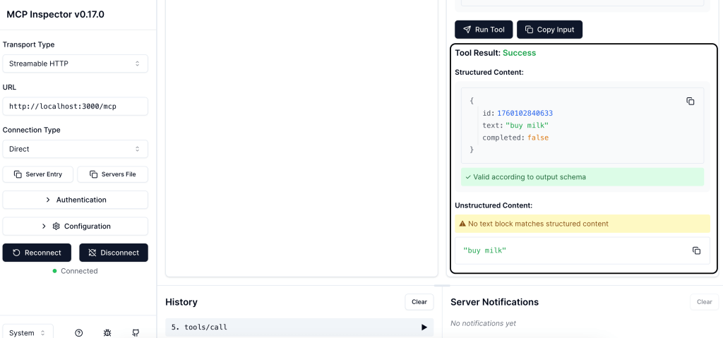 We can test this by MCP Inspector, go to List Tools, then select the tool and choose Run tool.